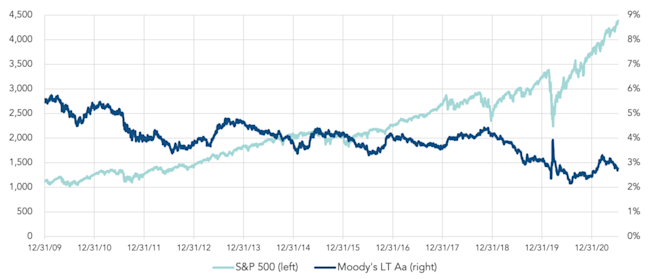 S&P 500 vs. Moody’s Long-term Aa since 12/31/2009