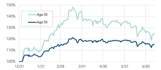 We have been tracking the relationship between a DC participant’s asset and (lifetime income) liability portfolios for more than a year now. To do this, we track the effect of asset gains/losses and interest rate increases/declines for two example participants (ages 35 and 55). The chart below illustrates how the retirement income of these participants has fared over the first part of 2021.