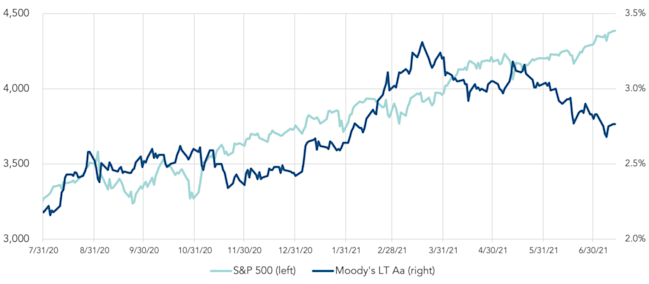 S&P 500 vs. Moody’s Long-term Aa since 7/31/2020