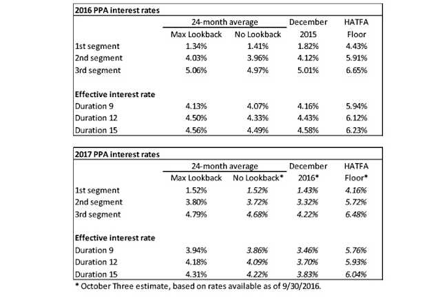 The table below summarizes rates that plan sponsors are required to use for IRS funding purposes for 2016, along with estimates for 2017. Pre-relief, both 24-month averages and December ‘spot’ rates, which are still required for some calculations, such as PBGC premiums, are also included.