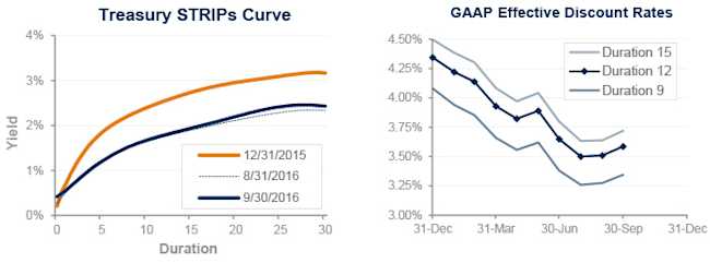 Pension liabilities (for funding, accounting, and de-risking purposes) are now driven by market interest rates. The graph on the left compares Treasury STRIPs yields at December 31, 2015 and September 30, 2016, and also shows the movement in rates last month. The graph on the right shows our estimate of movements in effective GAAP discount rates for pension obligations of various duration during 2016:
