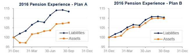 Interest rates were up a couple basis points at short maturities and 0.1% at longer maturities last month, providing downward pressure on pension liabilities, which fell less than 1% during September. Rates remain near all-time low levels, however, and pension liabilities remain 10%-14% higher than at the end of 2015, with long duration plans seeing the biggest increases.