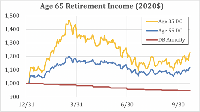 As the chart makes clear, both the age 35 and the age 55 DC (non-annuitizing) participants have done well this year. Currently, they are able to buy (in $2020, that is, after adjusting for inflation) significantly more retirement income than they could at the beginning of the year.