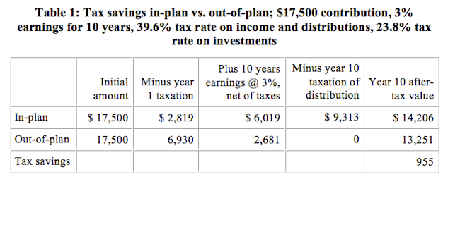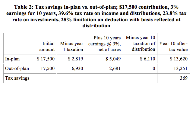 We assume that the participant invests ‘out of plan’ savings in capital gains-generating investments and that the full amount of capital gains is taxed each year at the (lower) capital gains rate (under current rules, you would get the same result if you invested in dividend producing stocks). (A ‘buy and hold’ capital gains strategy — where no capital gains were realized until the end of the 10 year period — would produce a slightly better tax result for the ‘out of plan’ saver.)